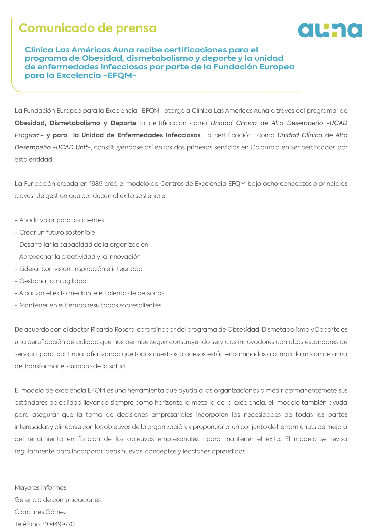 Nueva certificación de la Fundación Europea para la Excelencia -EFQM- para el programa de Obesidad, Dismetabolismo y Deporte y la unidad de Enfermedades Infecciosas de Clínica Las Américas Auna como Unidades Clínicas de Alto Desempeño -UCAD-