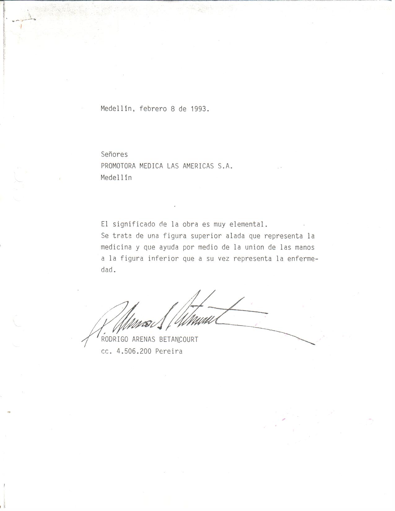 El 26 de octubre de 1995 fue entregada a la comunidad la obra monumental del Maestro Arenas que representa dos figuras, la primera de las cuales es un ser alado, que como un ángel ayuda por medio de la unión de las manos a la otra que a su vez representa la indefensa condición en el estado de enfermedad. Así mismo, la medicina es ese ángel que invita permanentemente al bienestar del ser humano. La obra se hizo en bronce fundido.